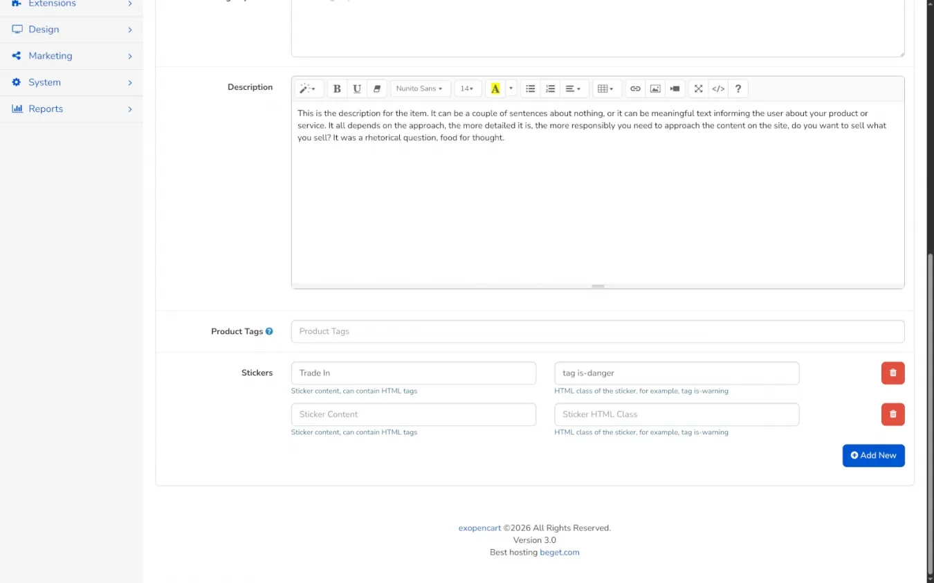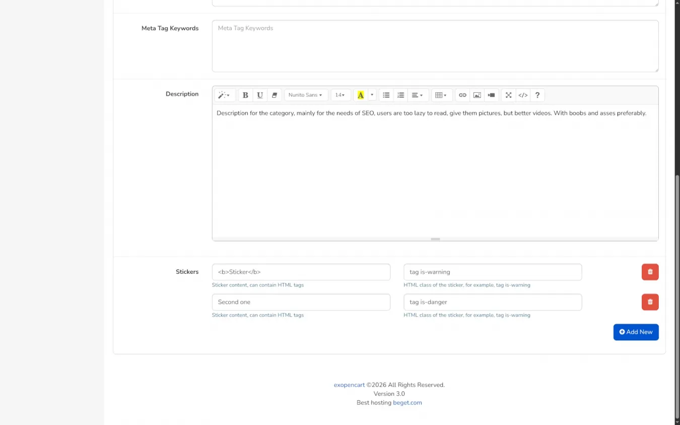 - Стикеры и для товаров, и для категорий. Для каждого языка отдельно: текст или HTML, плюс произвольный класс (по умолчанию Bulma 'tag', а вообще пиши что хочешь). Просто и гибко.