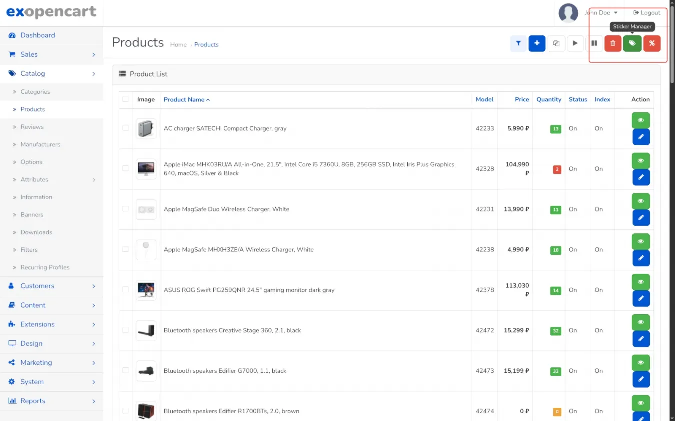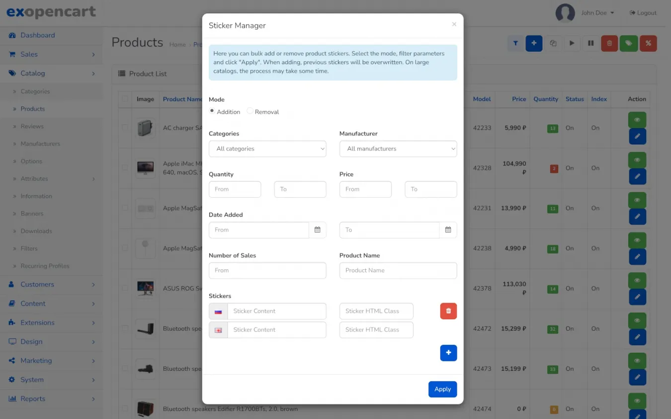 - Массовое управление для товаров: по категории, производителю, количеству на складе, диапазону цены, дате добавления, количеству продаж, названию. Выбираешь условия, создаешь стикеры, жмешь "Добавить", вуаля. Точечно править для каждого товара - тоже можно.