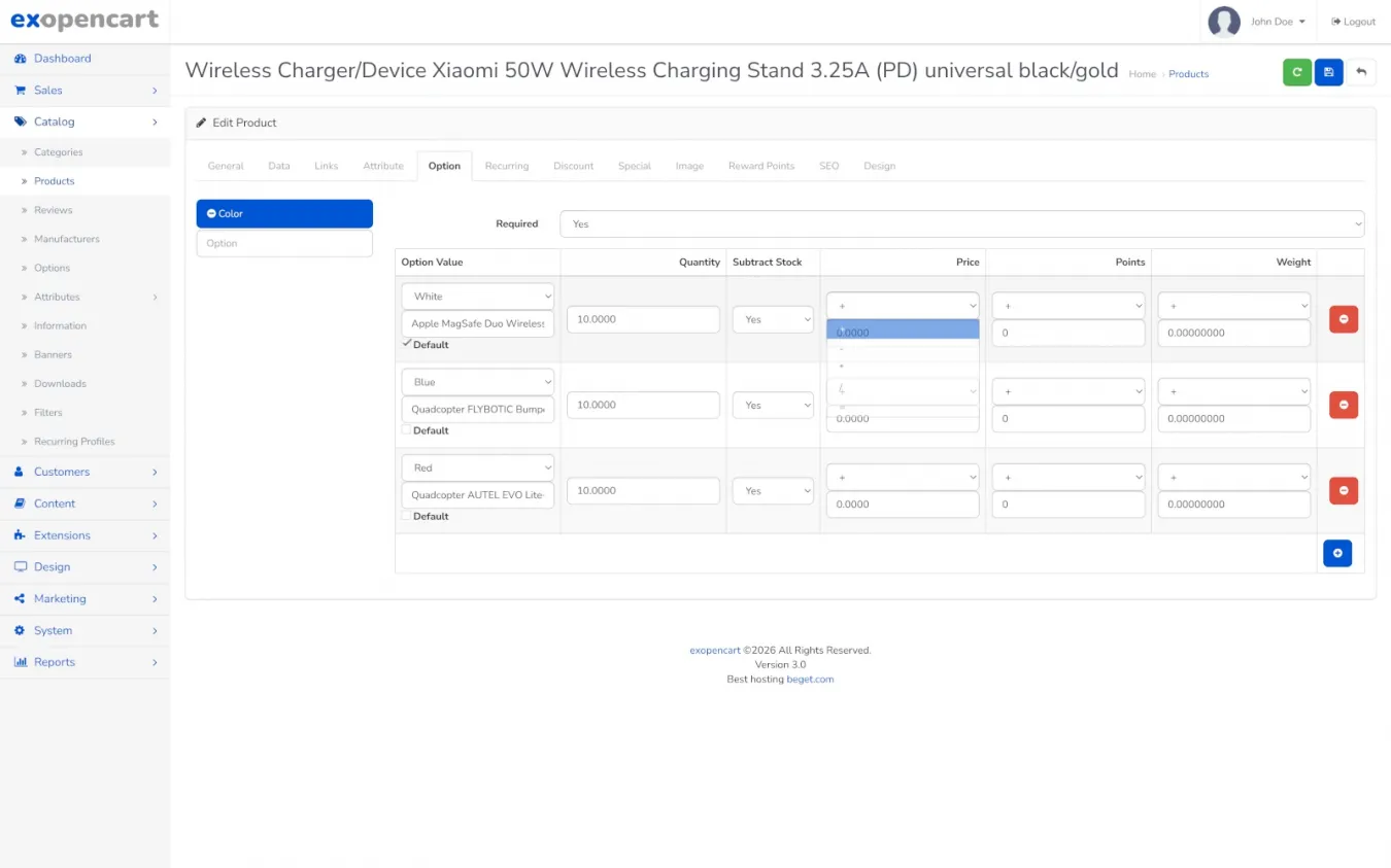 Дефолтные опции в OpenCart как резиновая вагина, вроде не дрочишь, но и сексом назвать сложно. Добавляешь опцию "цвет", "размер" или "мощность" - и цена корректируется только через плюс-минус. Хочешь цену в полтора раза больше? Cиди высчитывай разницу вручную. А дефолтное выбранное значение? Ага, размечтался.